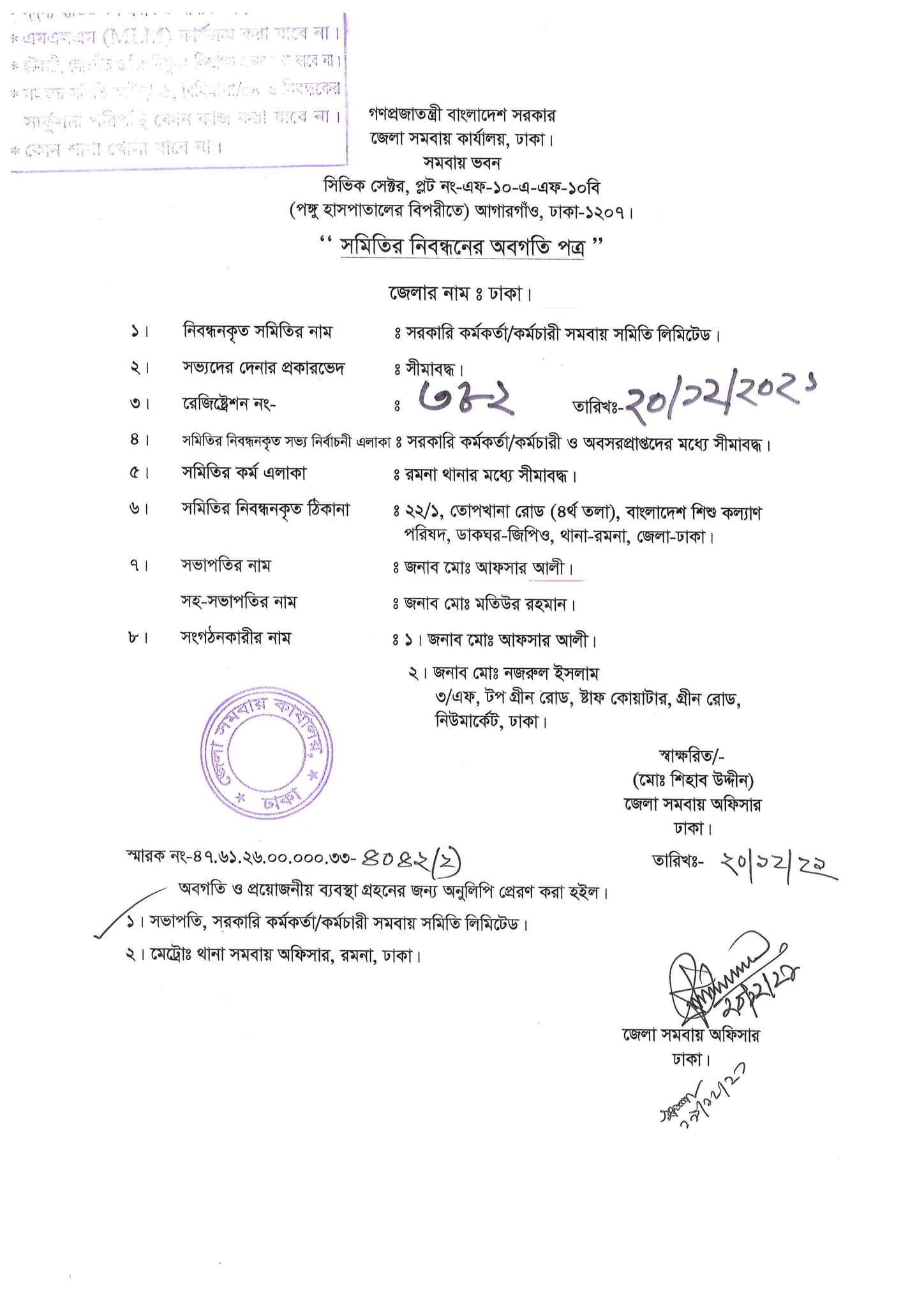 সমিতি নিবন্ধনের অবগতি পত্র